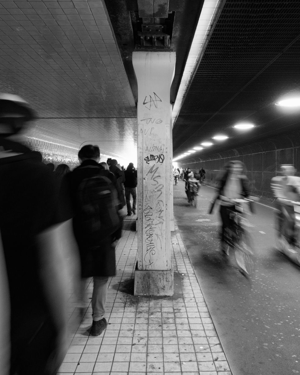 High-contrast monochrome capturing the strong forms of city architecture alongside the fleeting human drama they contain